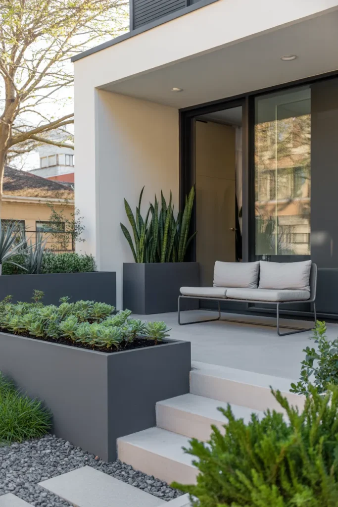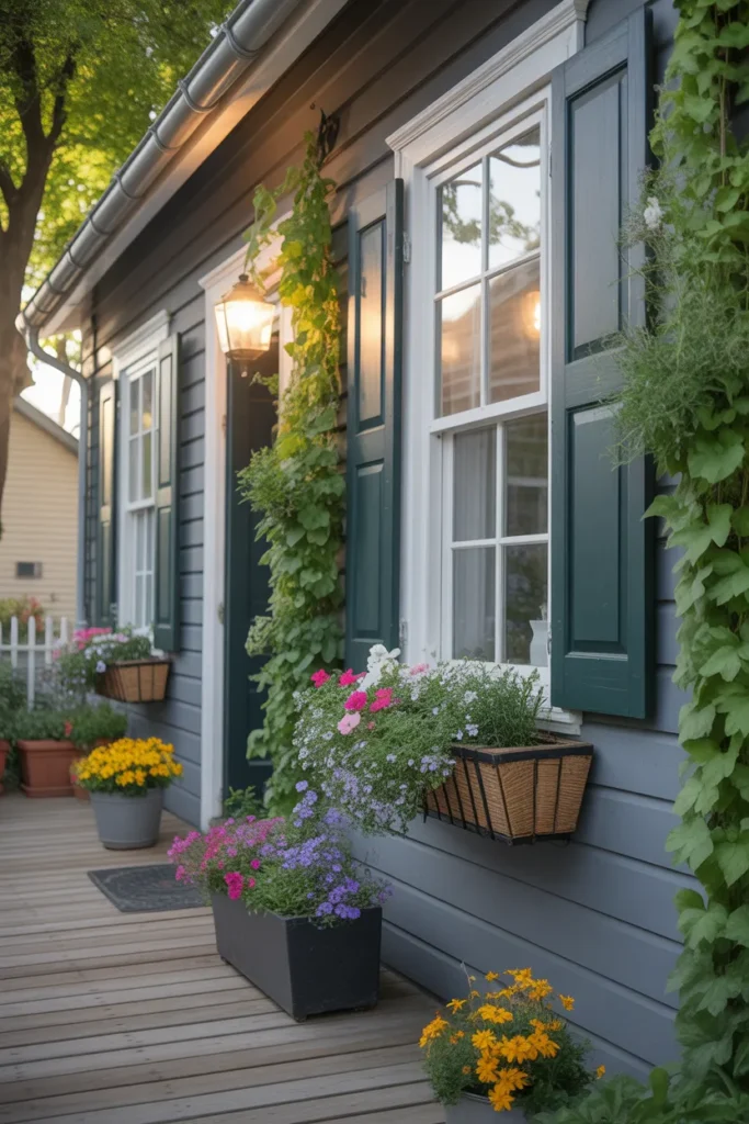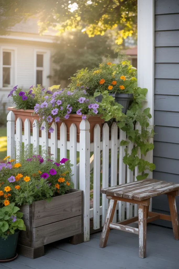 Small fence-style planters give a cottage-like charm. Place them along steps or corners for added structure. Fill with colorful seasonal flowers to highlight the look. They create a nostalgic, inviting atmosphere.
