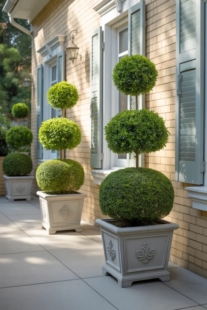 Topiaries give a formal yet charming look. Place them on either side of steps or doors for balance. They can be shaped seasonally for interest. Their structured greenery contrasts beautifully with softer floral arrangements.