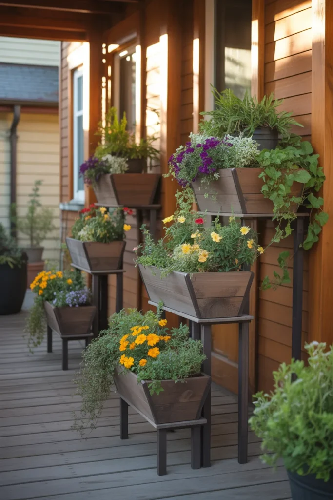 Tiered planter stands maximize space and variety. Display different flower heights to create dimension. Mixing textures and colors adds richness. They are especially effective for small porches needing a vertical pop of greenery.