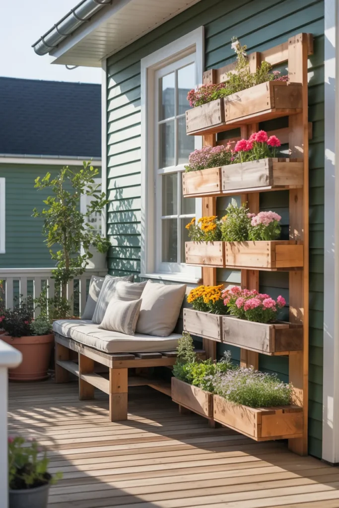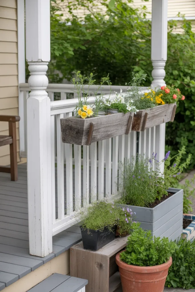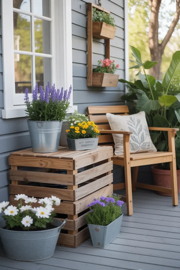 Wooden pallet planters add rustic charm and maximize space. Layer them vertically to showcase multiple plants. Mix flowers, herbs, and trailing greenery for interest. They are perfect for creating a unique focal point on your porch.