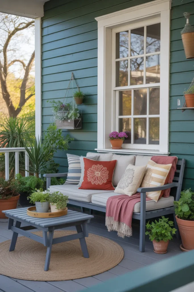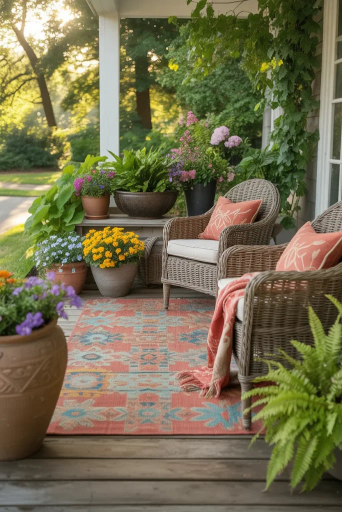 An outdoor rug ties your porch design together. Choose patterns that complement your seasonal color scheme. It adds comfort and defines the seating area. Layering rugs with planters can enhance visual interest