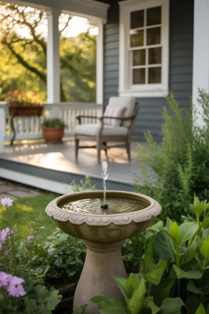 A water fountain adds movement and soothing sound. Position near seating for a calming effect. Surround it with low-maintenance plants to enhance tranquility. It elevates your porch into a peaceful retreat.