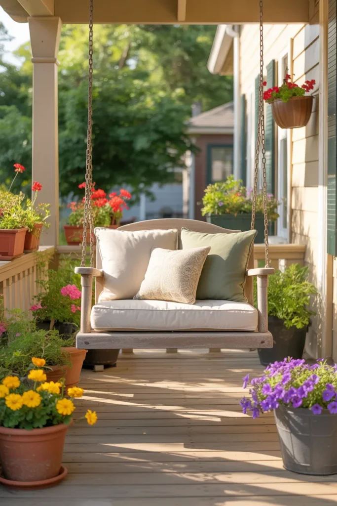 A porch swing adds a relaxing vibe instantly. Decorate with cushions and a throw for comfort. Surround it with flowers to make it a cozy retreat. Swings create movement and life in your porch design.