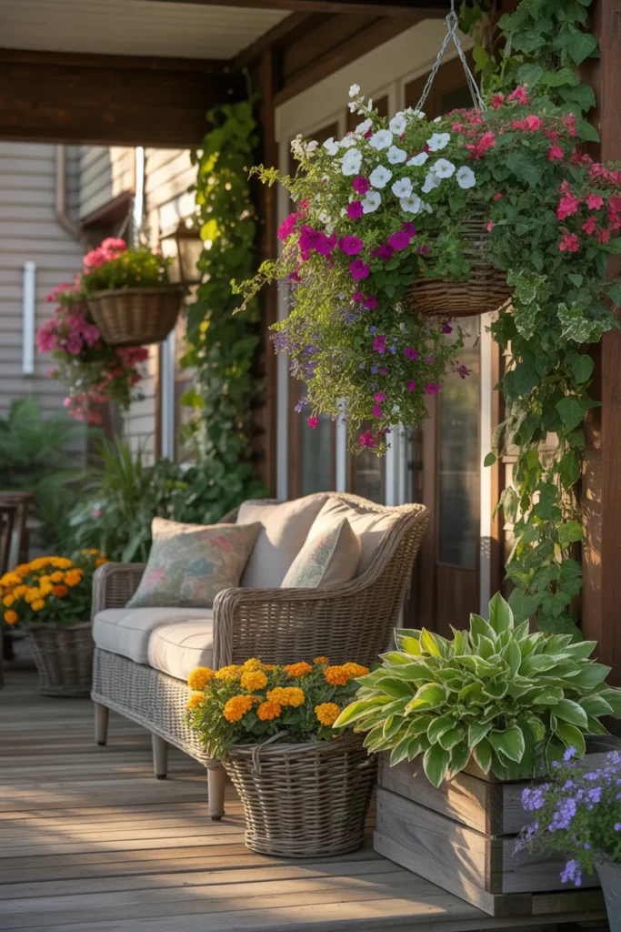 Hanging baskets add elegance without taking up floor space. They work beautifully with both small and large porches. Mix trailing vines with bright blooms for contrast. This approach creates a vertical garden effect right above your steps