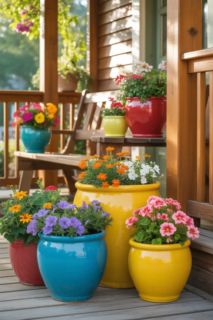 Painted planters add personality and vibrancy. Use bold colors to make seasonal blooms pop. Coordinate with other porch accents for cohesion. It’s a simple way to energize the space and showcase creativity.