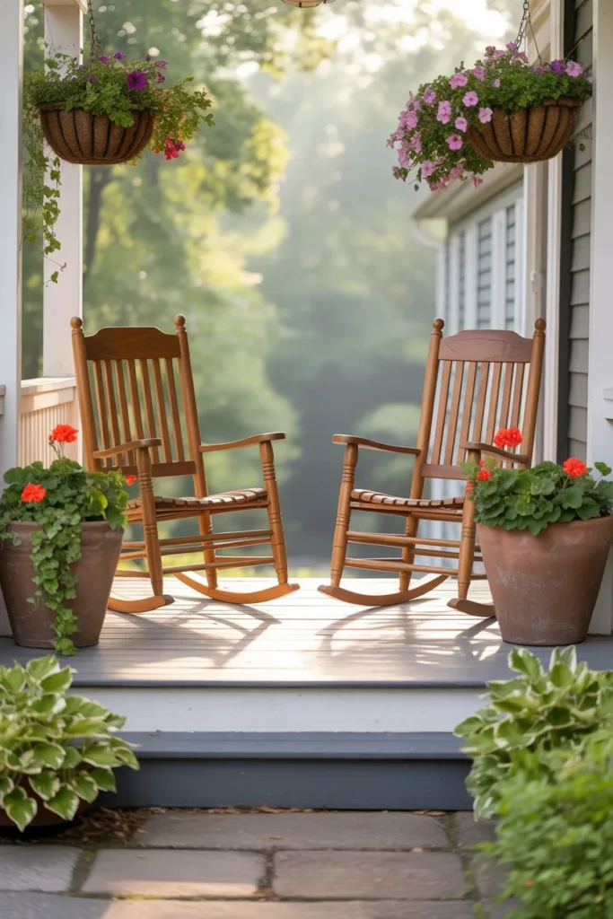 Rocking chairs give a timeless, welcoming touch. Pair them with small side tables for drinks or decor. Add cushions in seasonal colors for extra comfort. They make your porch a perfect spot to relax and enjoy the view.