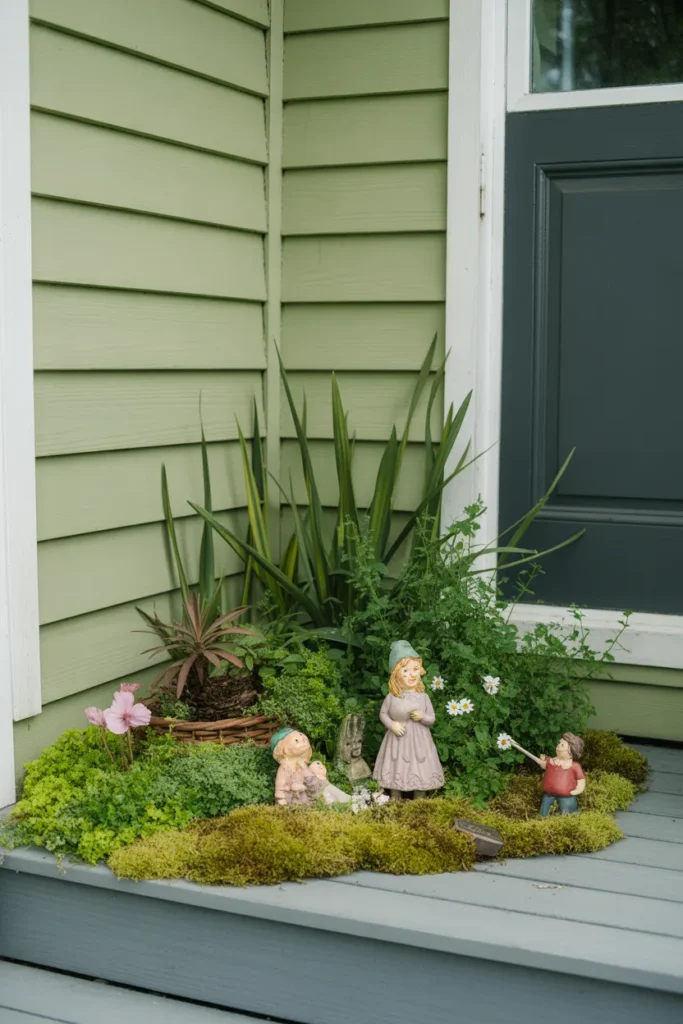 Fairy gardens bring charm and imagination to the porch. Use tiny plants, figurines, and pebbles for creativity. They fit well in corners or on steps. This playful addition delights both kids and adults.
