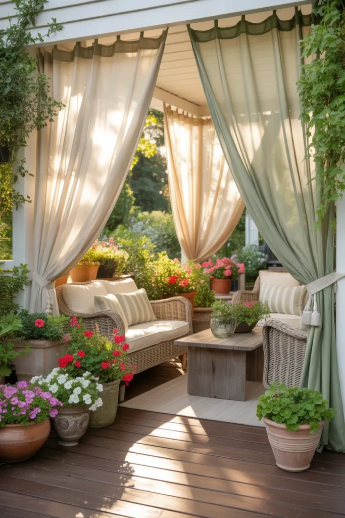 Outdoor curtains add softness and privacy. They create a gentle, flowing backdrop for your porch furniture. Pair with plants to frame the space naturally. They also help block harsh sunlight while enhancing style.