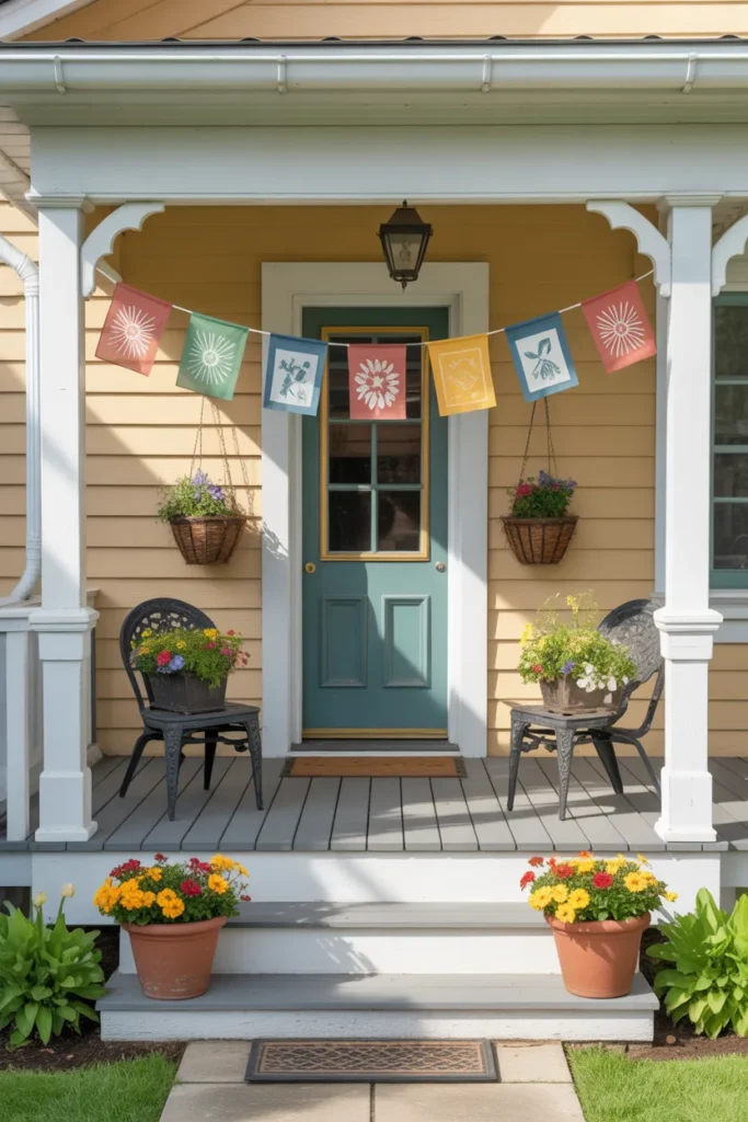 Flags offer a quick seasonal update without heavy effort. Place them near planters or railing for visibility. Change designs with the seasons for variety. They instantly brighten the porch and create festive energy.