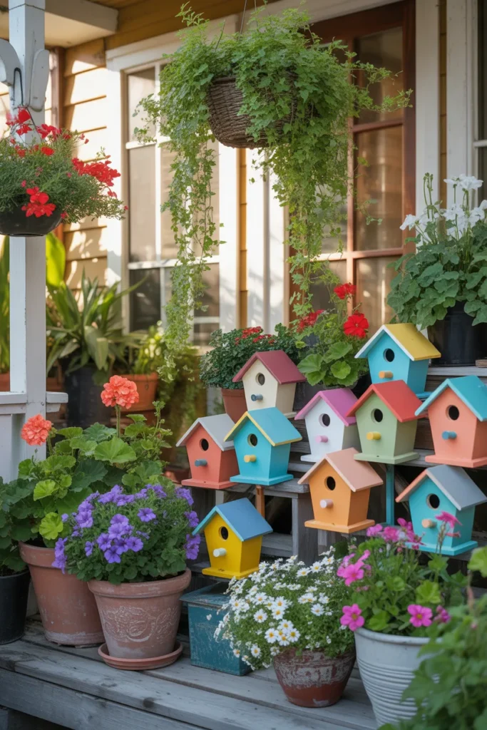 Birdhouses add charm and attract wildlife to your porch. Hang them near planters for a natural feel. They enhance the seasonal vibe and create movement with visiting birds. It’s an engaging, playful decoration.
