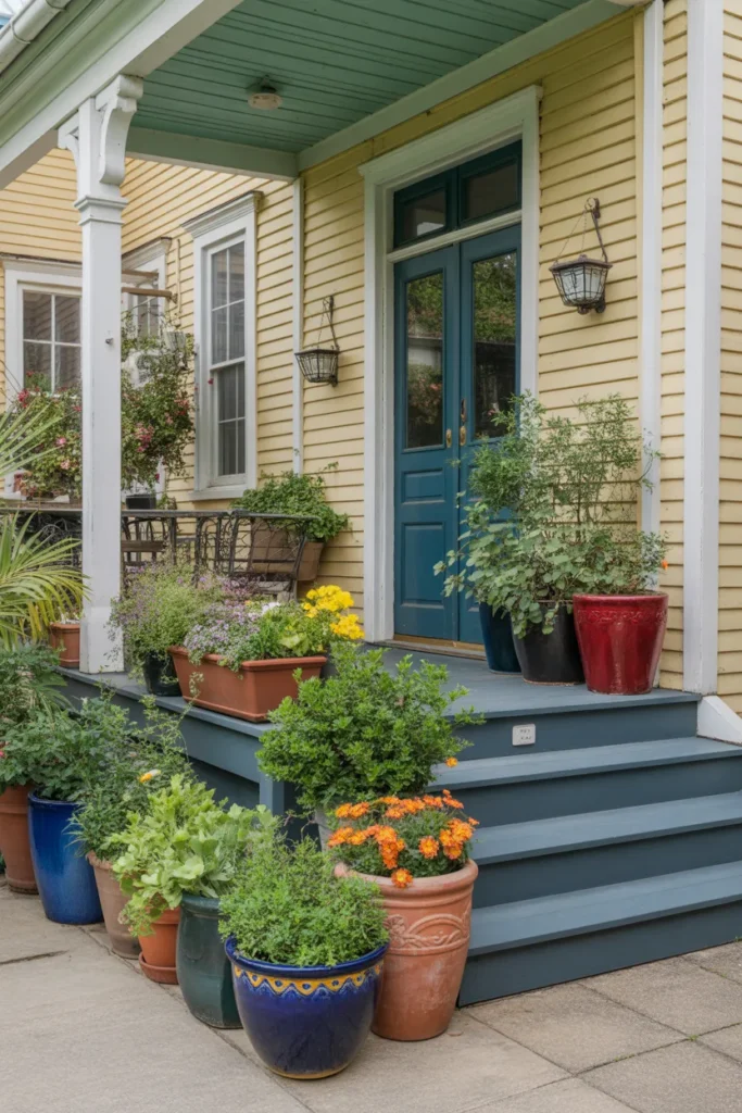 Grouping plants of different colors adds depth and variety. Arrange them at varying heights for a dynamic display. Mix textures like leafy plants and blooms. It’s a simple way to energize the porch without overdecorating.