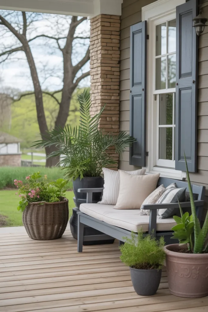 A wooden bench provides both charm and functionality. Decorate it with seasonal pillows and small planters. It encourages relaxation while complementing natural surroundings. Paired with greenery, it becomes the focal point of your porch.