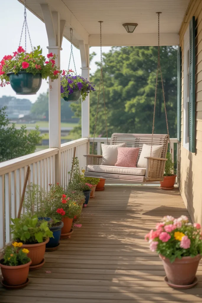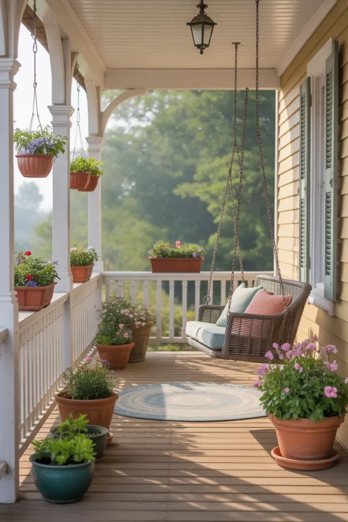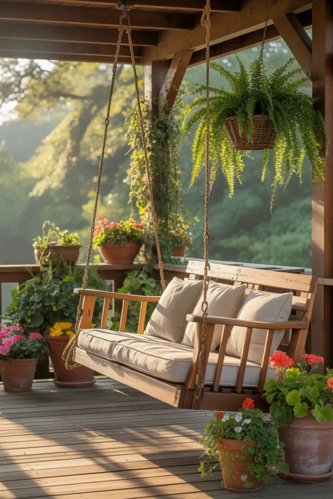 Swing chairs create a relaxing and modern touch. Add soft cushions for extra comfort. Hanging them near greenery creates an inviting nook. They bring playful movement to the porch’s aesthetic.