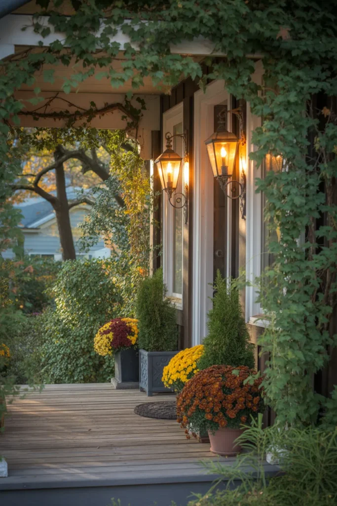 Lanterns add a warm glow to your porch during evenings. Use them along steps or near planters for a magical effect. They enhance the ambiance while improving visibility. Seasonal decorations nearby enhance the welcoming feel.