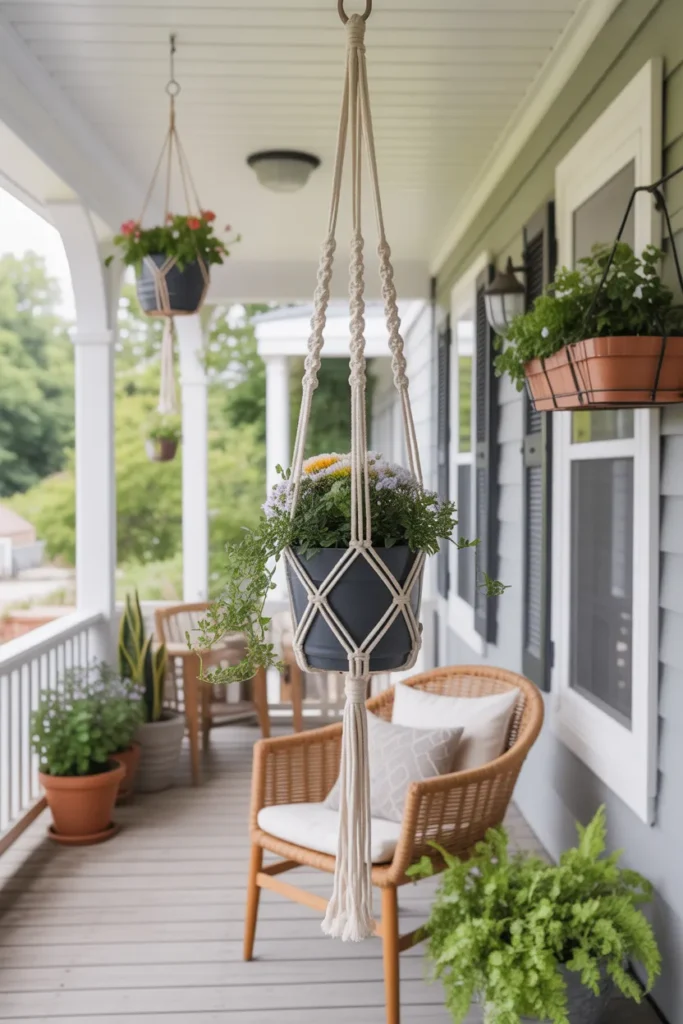 Macrame hangers add texture and a bohemian touch. Use them to suspend trailing plants for vertical greenery. They blend well with natural wood or metal accents. This style brings elegance and creativity to your porch.