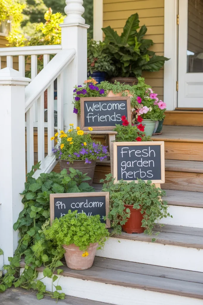 Chalkboards provide a playful way to greet guests or display seasonal messages. Pair with planters or seating for cohesion. They can be updated easily to match holidays or seasons. These small touches make the porch feel personalized.