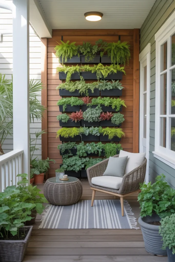 Vertical gardens save space while adding lush greenery. They can be mounted on walls or railing areas. Mixing textures like ferns, succulents, and flowers brings depth. This creates a refreshing green backdrop for your porch seating.