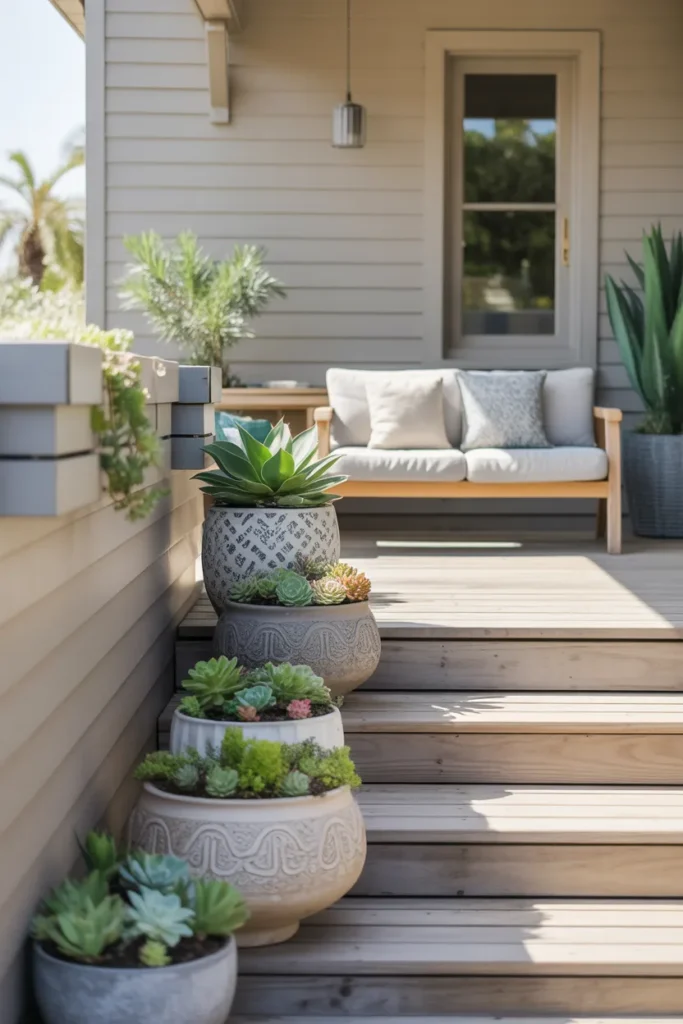 Succulent displays are low-maintenance and stylish. Tiered arrangements create depth and visual interest. Combine different shapes and colors for dynamic appeal. They bring a contemporary, refreshing vibe to your porch.