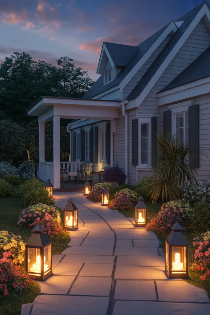Lanterns paired with seasonal greenery create a cozy glow. Use them on steps or near seating areas. Adding small plants inside or around lanterns enhances visual appeal. This combination brings warmth and charm year-round.