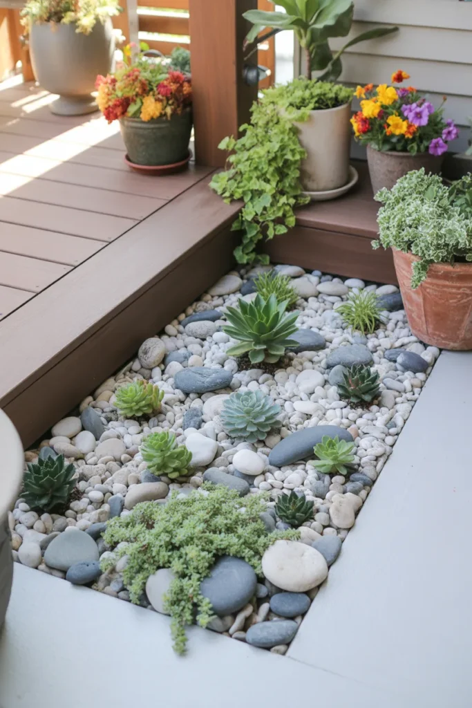 Rock gardens provide texture and low-maintenance appeal. Use a mix of stones, pebbles, and small plants. They pair beautifully with other seasonal elements. It’s a sophisticated touch that balances color with natural textures.