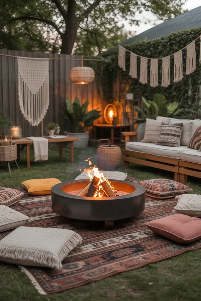 A boho fire pit corner adds a relaxed and artistic touch to your backyard. Layered textiles and natural elements create a warm and inviting space. It’s ideal for those who love a free-spirited and cozy outdoor aesthetic.