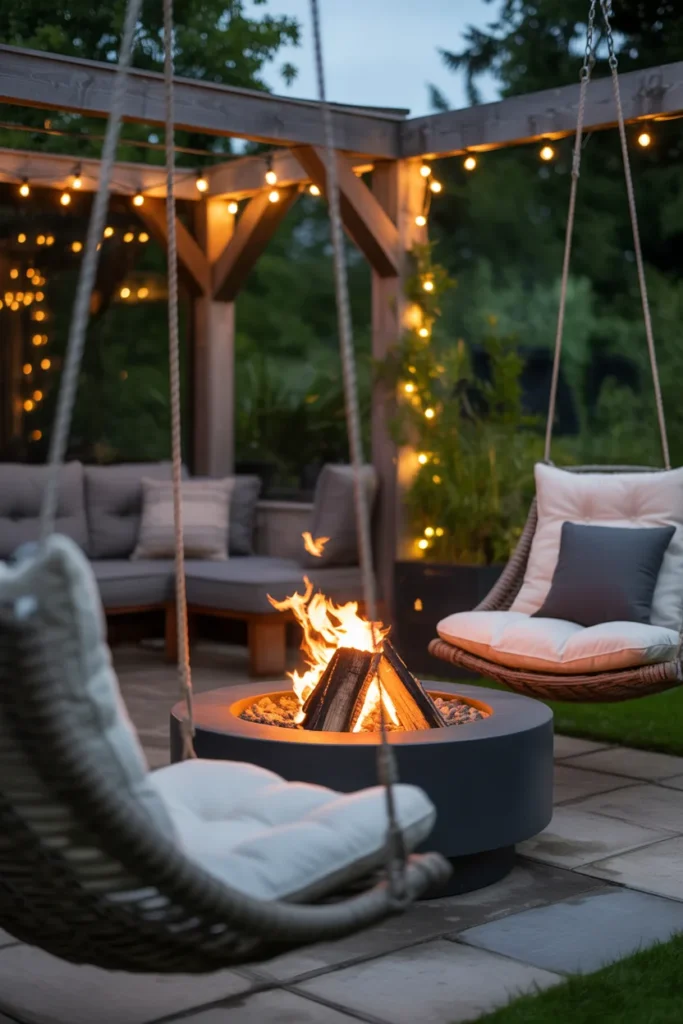 Swing seating around a fire pit adds a playful and relaxing element to your backyard. The gentle motion enhances comfort and makes the space feel unique. It’s a perfect combination of fun and coziness.