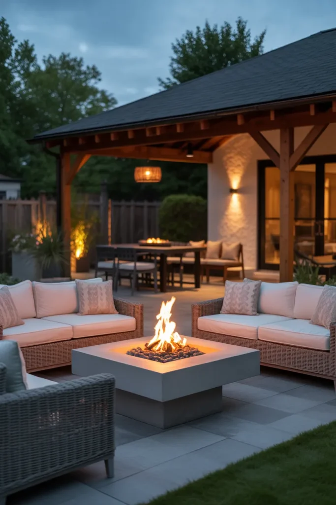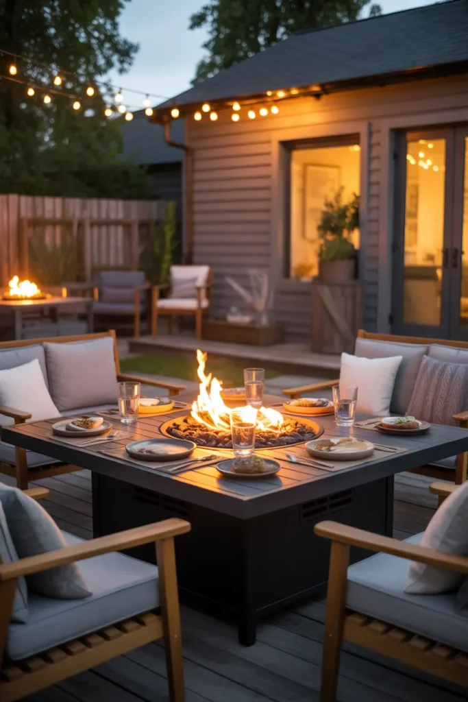 A fire pit dining area combines warmth and functionality for outdoor meals. It allows you to enjoy dinners comfortably even during cooler evenings. This setup creates a welcoming atmosphere perfect for memorable gatherings.