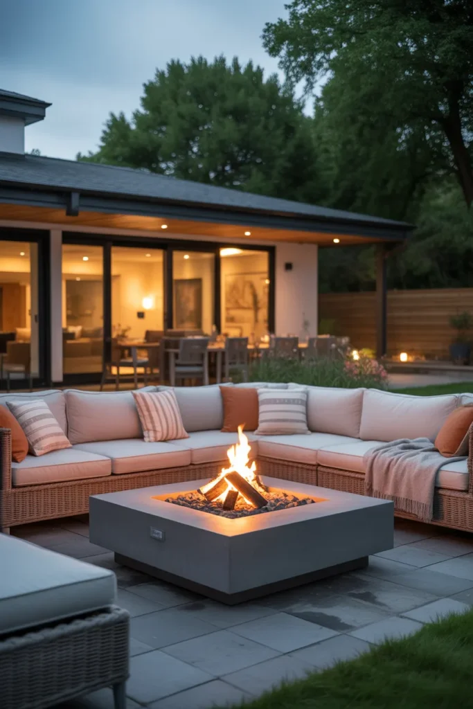 An outdoor sofa around a fire pit creates a living room feel in your backyard. It offers comfort and space for relaxing with family or guests. This setup blends indoor comfort with outdoor charm.