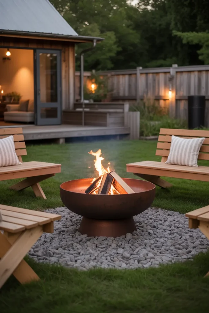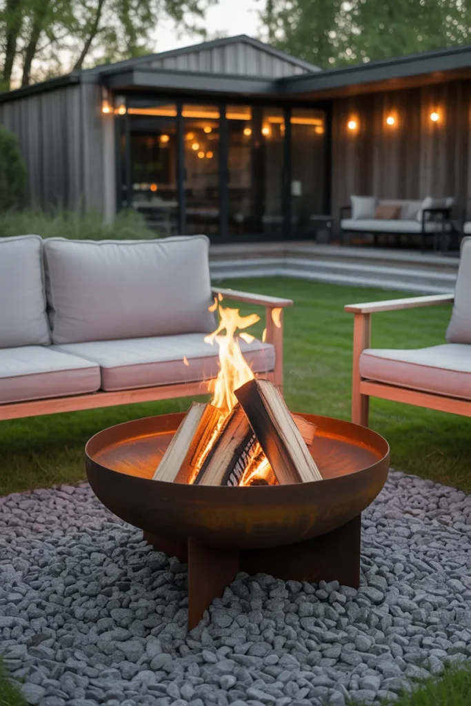 Combining steel and gravel creates a modern industrial fire pit design. The contrast of materials adds depth and style to the space. It’s a great choice for a contemporary backyard look.