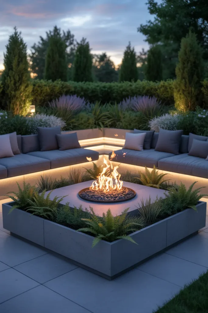 Built-in planters around a fire pit add life and color to the space. The greenery softens the design and makes the area feel more inviting. It’s a great way to combine nature with functionality.