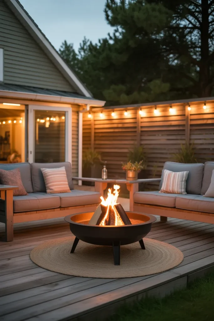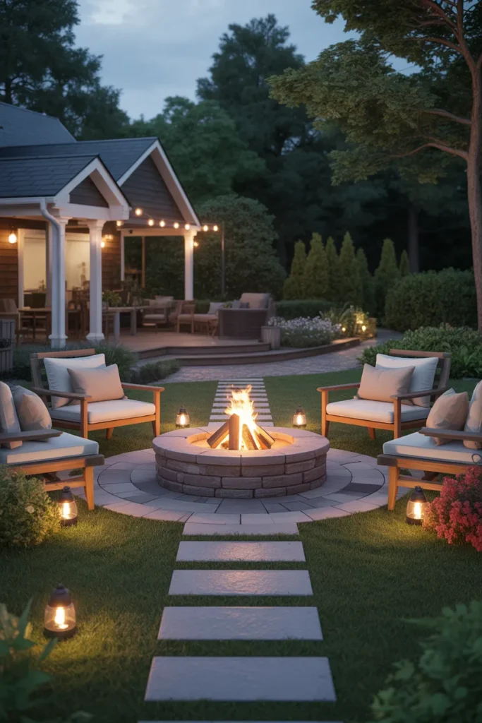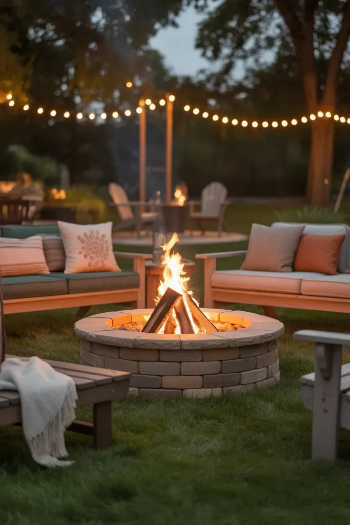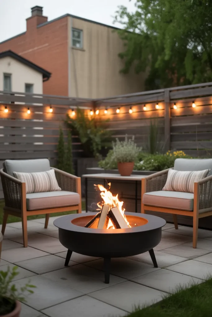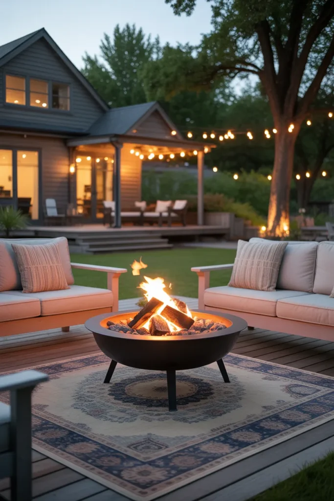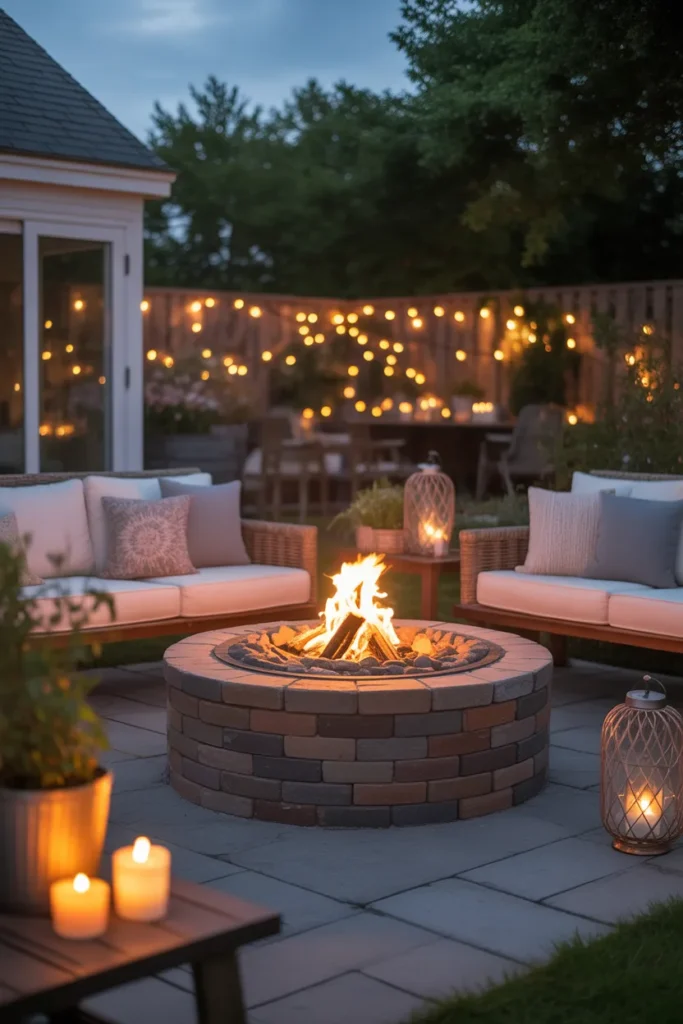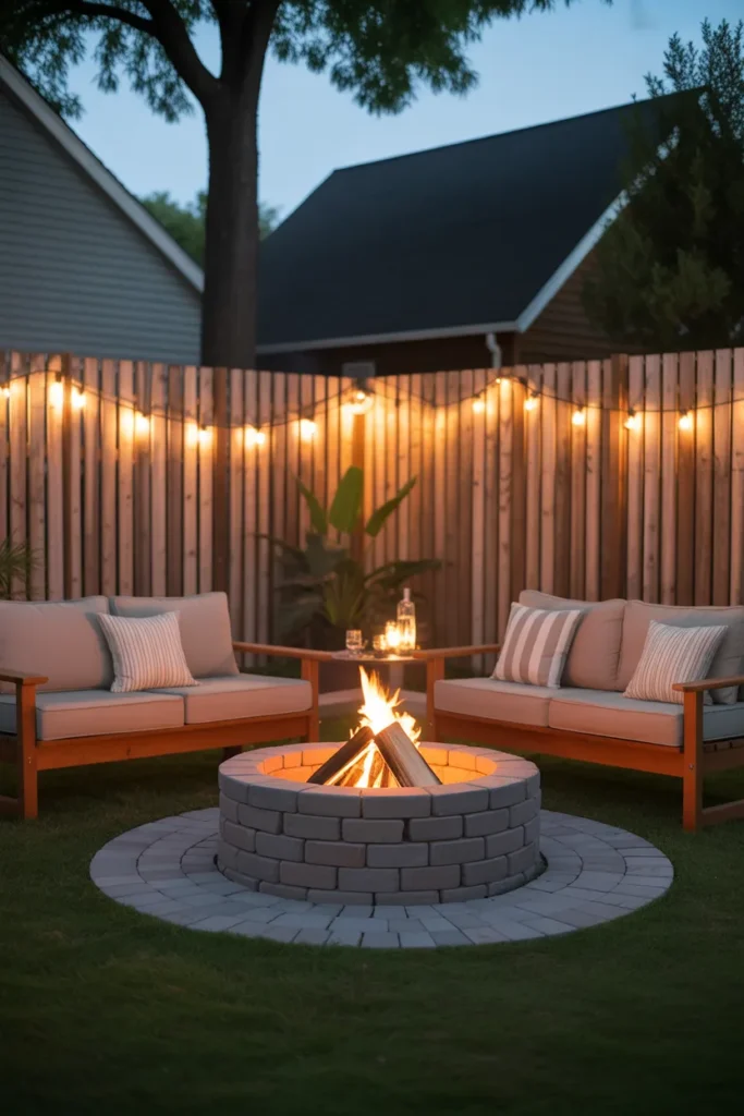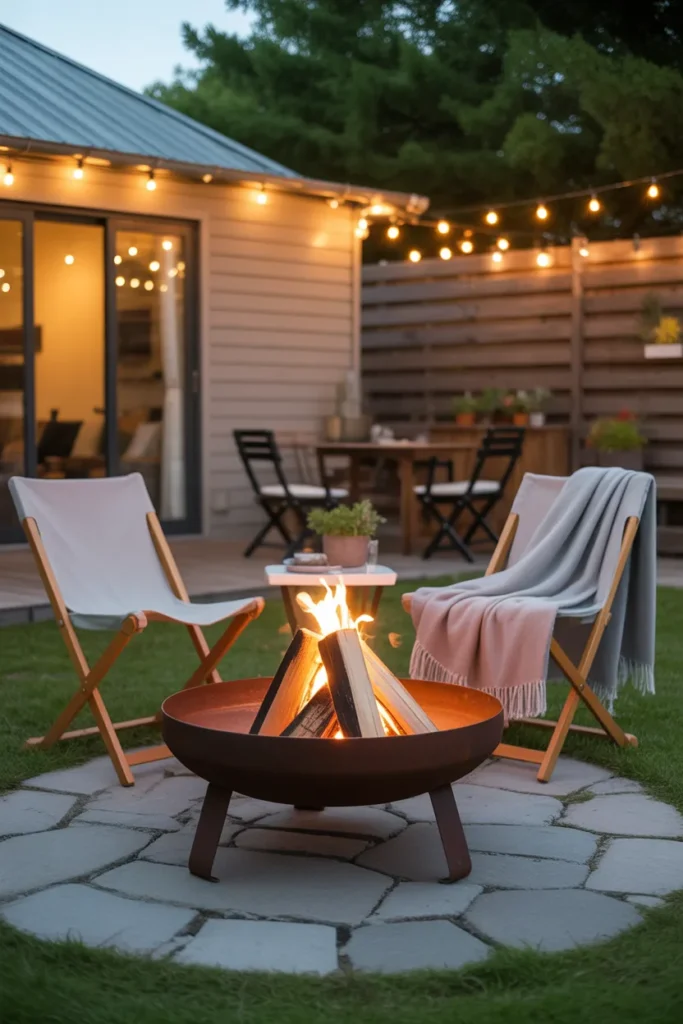 A fire pit paired with string lights instantly creates a magical backyard atmosphere. The soft glow from above complements the warmth of the fire beautifully. This setup is perfect for relaxing evenings and intimate outdoor gatherings.