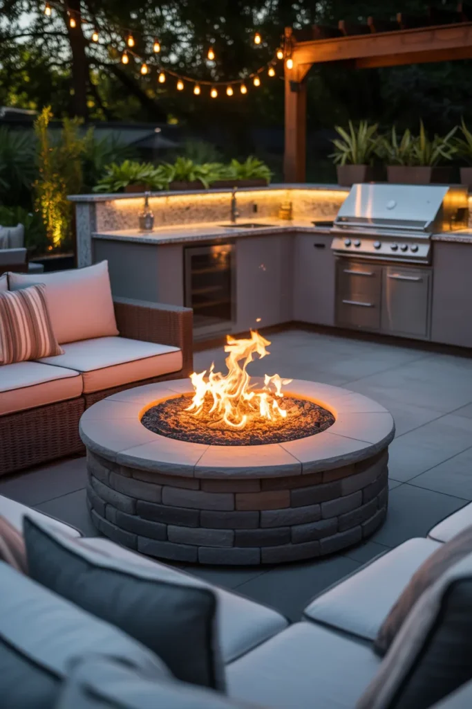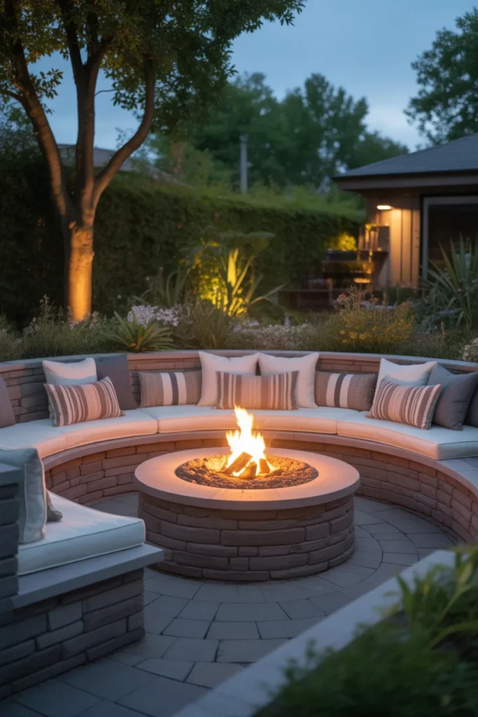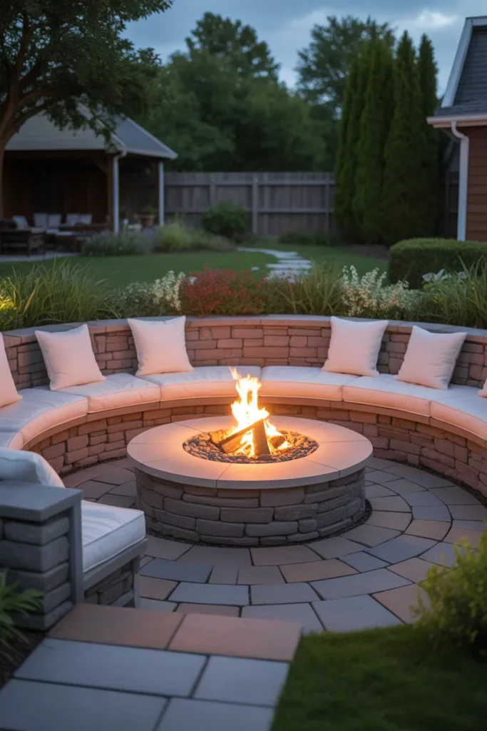 A circular seating wall around your fire pit creates a natural gathering spot. It encourages conversation while maintaining a clean and cohesive design. This layout is both functional and visually appealing.