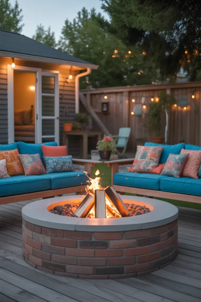 Adding colorful cushions around a fire pit brings energy and personality to the space. The vibrant tones contrast beautifully with the warm firelight. This setup creates a cheerful and inviting environment.