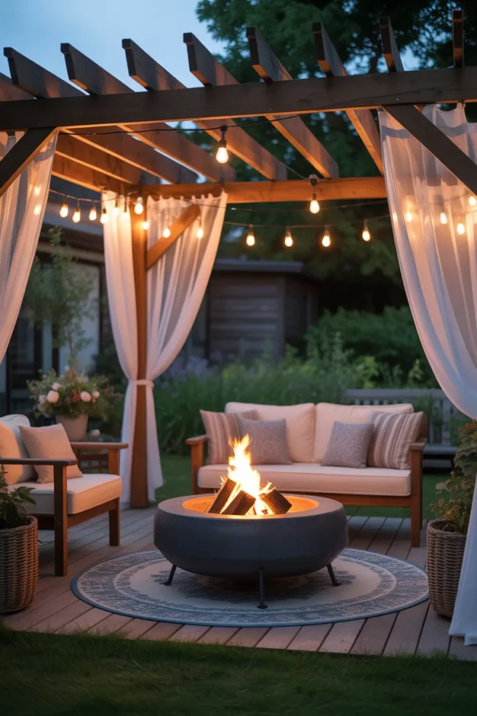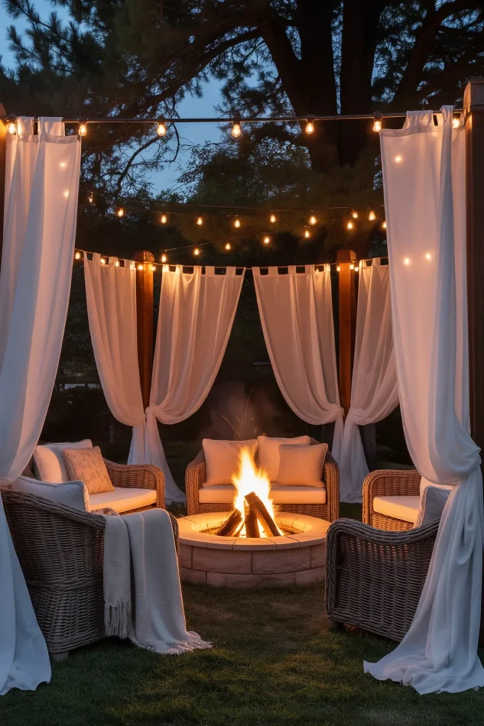 Outdoor curtains around a fire pit create a soft and intimate setting. They add movement and elegance while enhancing privacy. This design is perfect for a dreamy and relaxing backyard escape.
