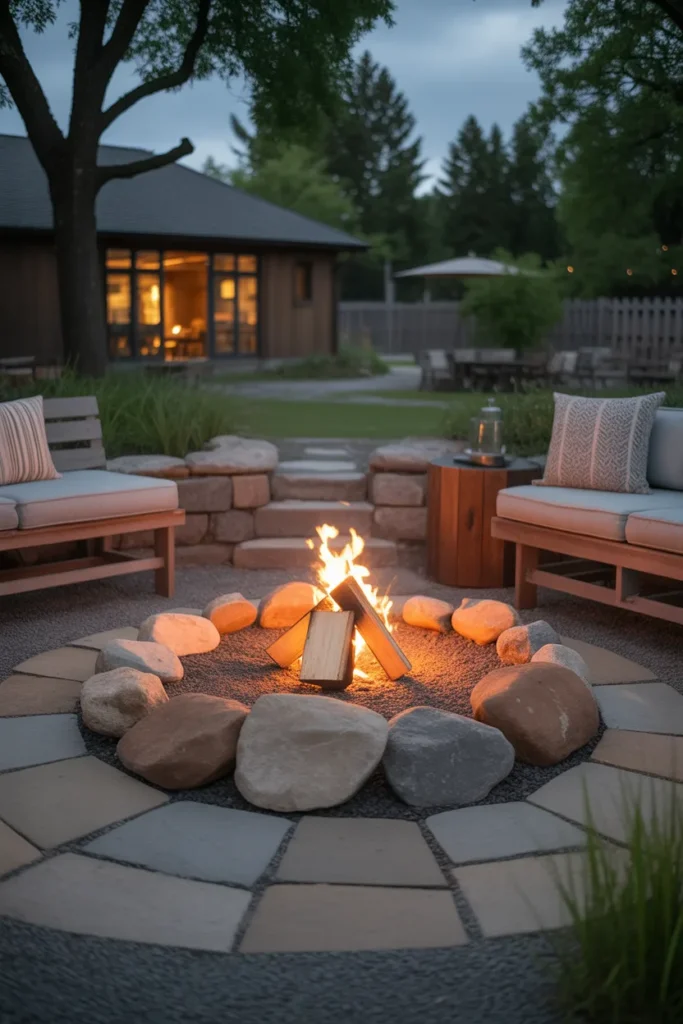 Natural rocks around a fire pit create a raw and earthy aesthetic. This design blends seamlessly with outdoor landscapes. It’s ideal for those who love a rugged and natural backyard style.