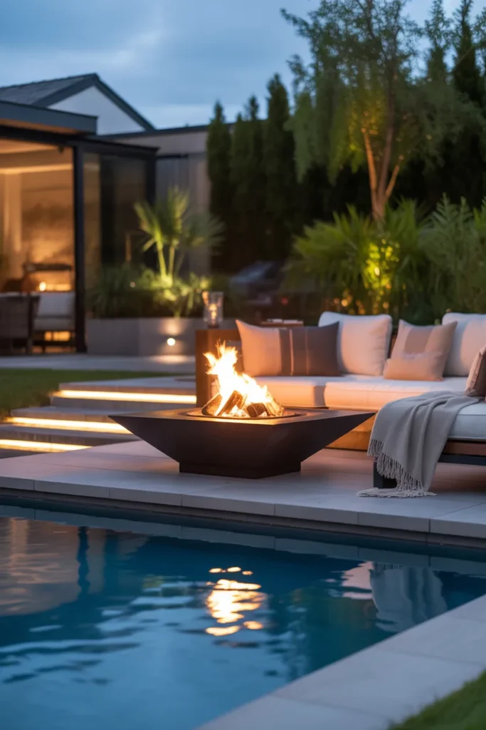 A fire pit near a pool adds a luxurious touch to your backyard. The reflection of flames on the water creates a stunning visual effect. This setup is perfect for stylish and relaxing nights.