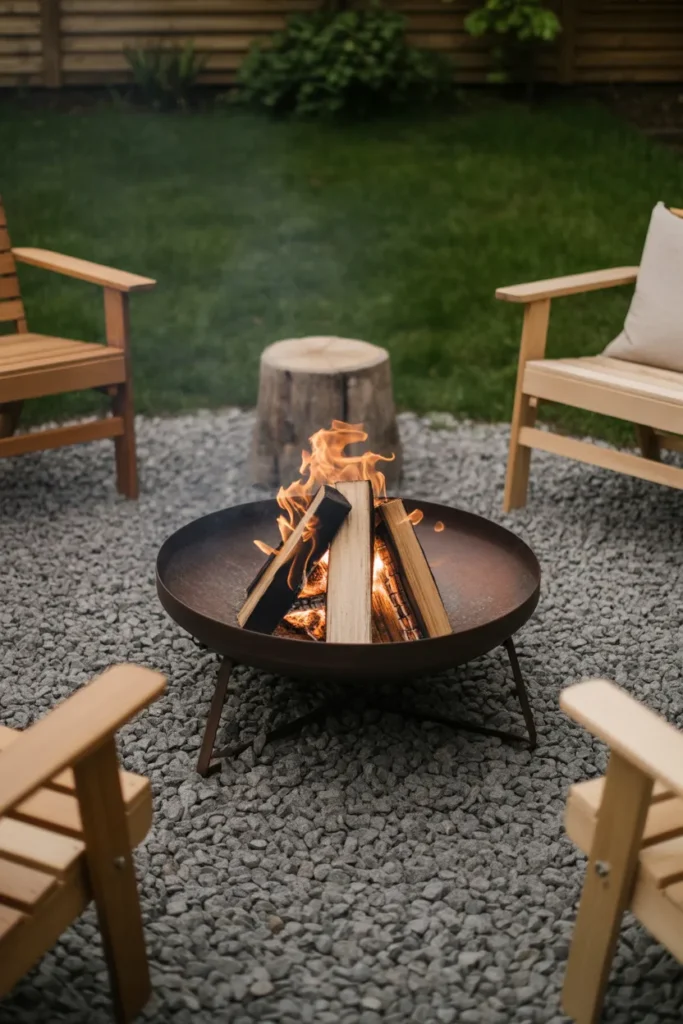 Combining gravel with wooden elements creates a balanced rustic-modern design. It’s both practical and visually appealing for outdoor use. This setup offers a cozy and stylish gathering area.