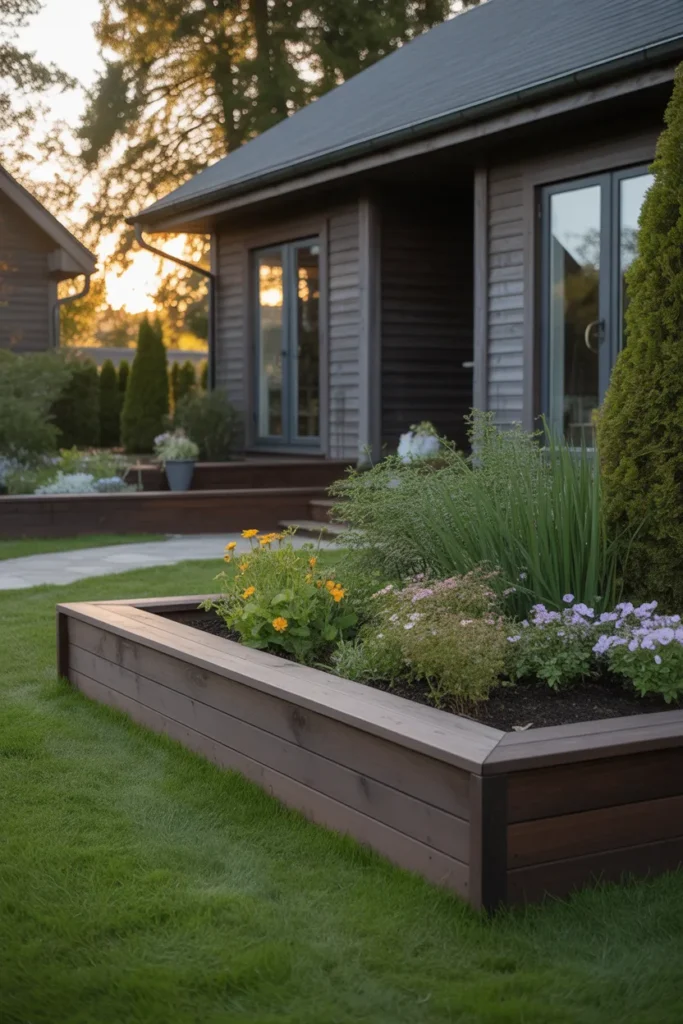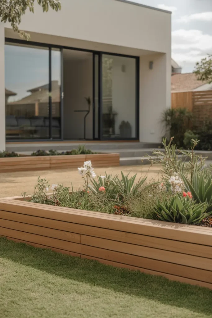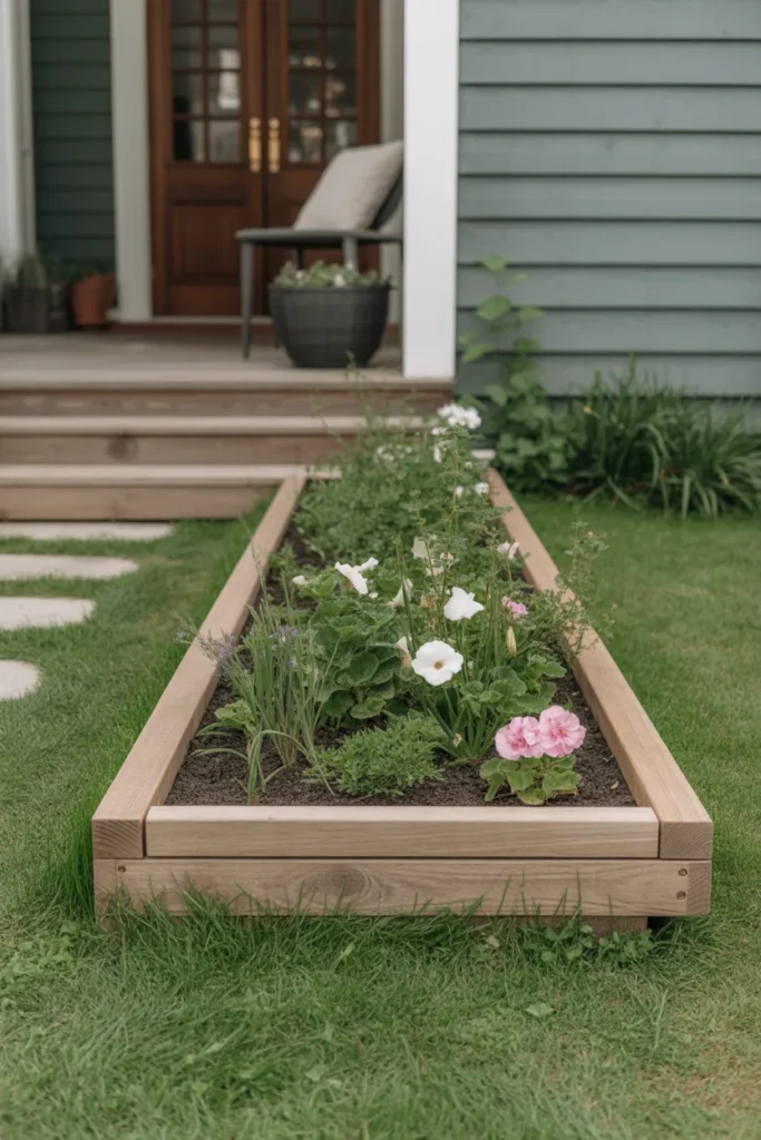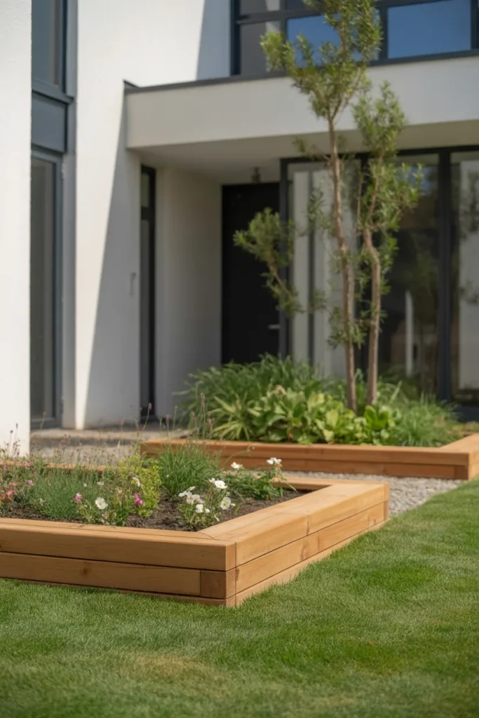 Raised wooden planter edging clearly defines planting areas. The elevated frame helps flowers stand out against the lawn. This style is ideal for showcasing seasonal blooms near the entrance. It combines functionality with strong visual impact.