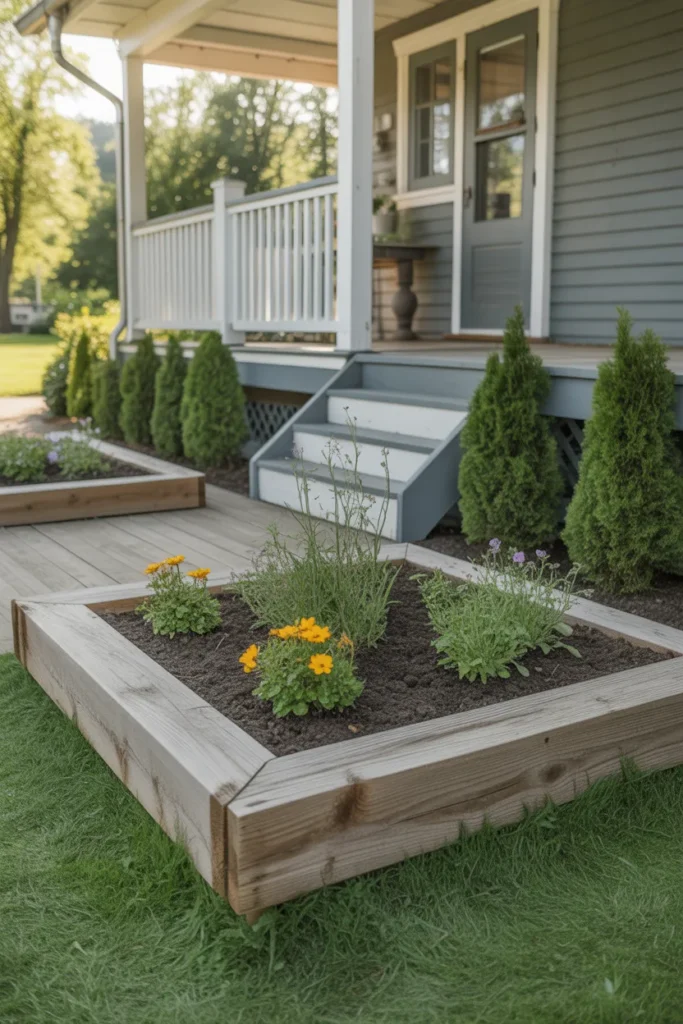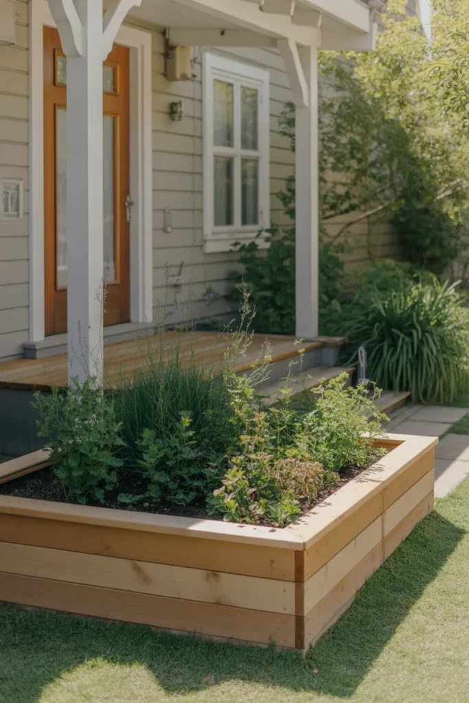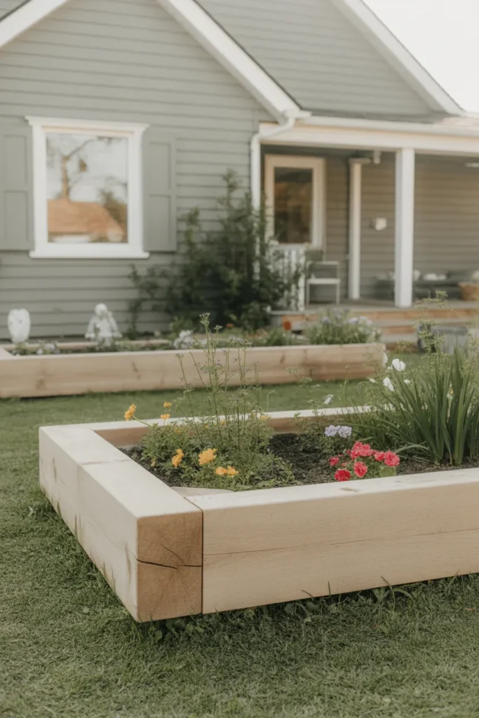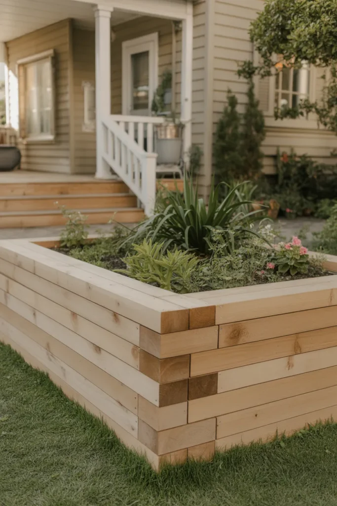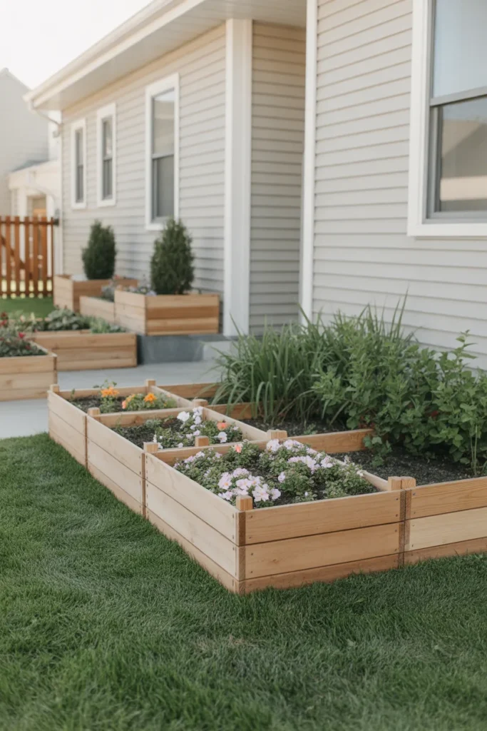 Raised wooden planter edging clearly defines planting areas. The elevated frame helps flowers stand out against the lawn. This style is ideal for showcasing seasonal blooms near the entrance. It combines functionality with strong visual impact.