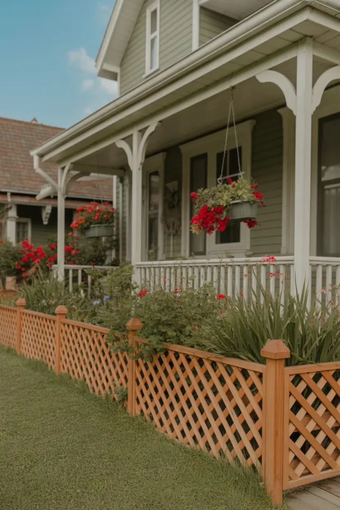 A wooden lattice border adds decorative detail to flower beds. The patterned design creates texture and visual charm. This style pairs beautifully with climbing plants and cottage-style homes. It enhances curb appeal with a delicate touch.