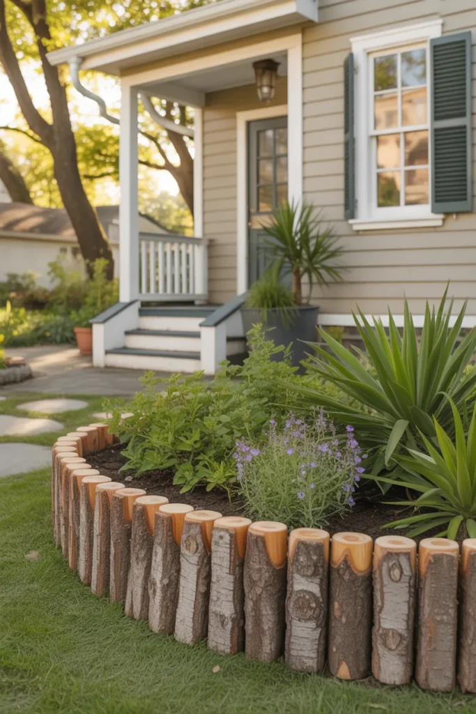 Rustic log roll edging adds warmth and texture to a front yard landscape. The rounded wood pieces create a soft border that complements curved flower beds beautifully. This option pairs perfectly with cottage-style or farmhouse exteriors. It gives the entrance of your home a welcoming and natural feel.