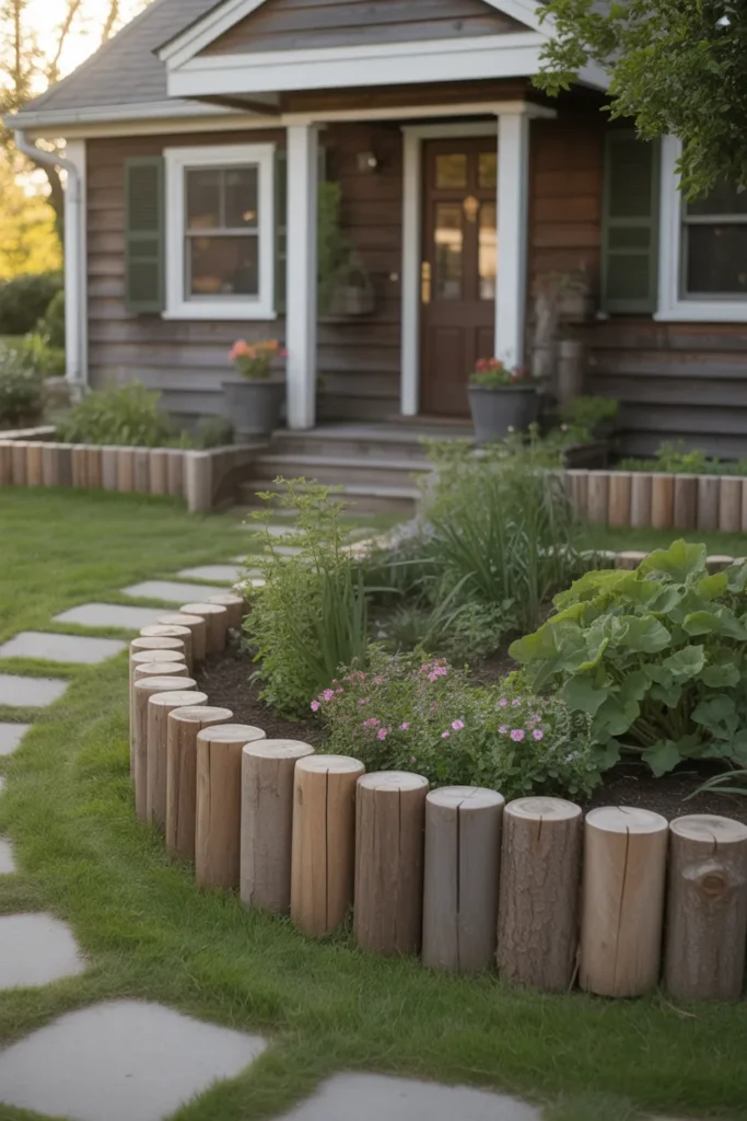 Rounded wooden beams soften the overall appearance of front yard landscaping. The smooth edges create a gentle transition between grass and plants. This style pairs well with curved walkways and organic garden layouts. It gives the home exterior a welcoming and balanced feel.