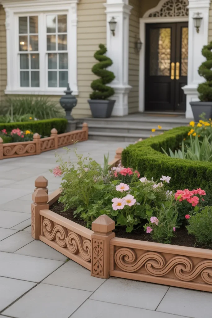 Decorative carved wood edging adds artistic detail to landscaping. The intricate patterns make flower beds stand out beautifully. This design complements traditional or vintage-style homes. It frames plants with elegance and personality.