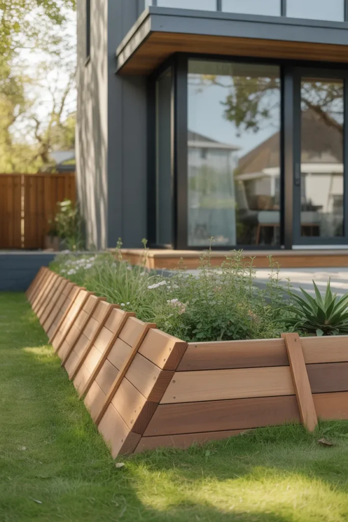 Angled wood panels introduce a modern and dynamic touch to your garden edging. The slanted design creates movement and visual interest. This option pairs well with contemporary house exteriors. It keeps flower beds neatly framed with a bold design element.