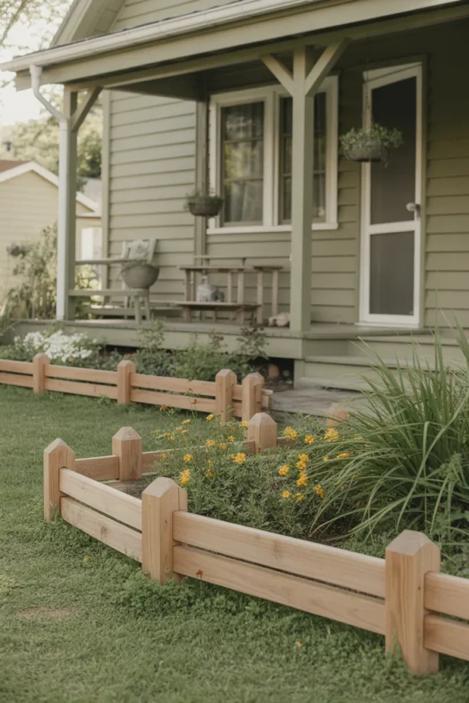 Split rail edging brings rustic charm to the front yard landscape. The simple rail design adds a farmhouse-inspired feel. This style works especially well with natural plantings and wildflowers. It creates a welcoming and relaxed atmosphere around your home.