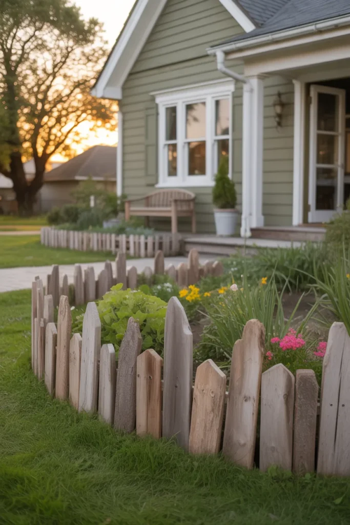 Weathered driftwood edging offers a relaxed coastal-inspired look. The natural textures blend beautifully with greenery and soft blooms. This option adds personality without appearing overly formal. It enhances curb appeal with a laid-back and artistic feel.
