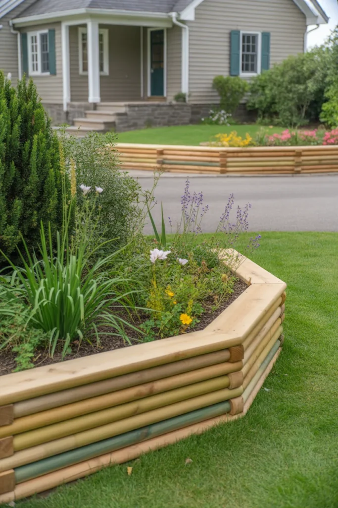 Stacked wooden beams add depth and dimension to front yard beds. The layered effect creates a subtle raised look that highlights plants beautifully. This edging works well for sloped lawns or elevated flower beds. It adds strength and visual interest to the landscape.