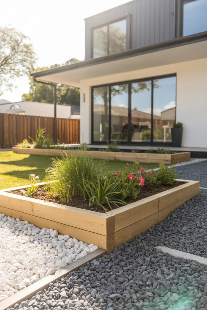 Combining wood with gravel creates a clean and modern contrast. The wooden edge keeps gravel neatly separated from grass and plants. This style works beautifully in minimalist landscapes. It enhances the overall front yard with texture and definition.