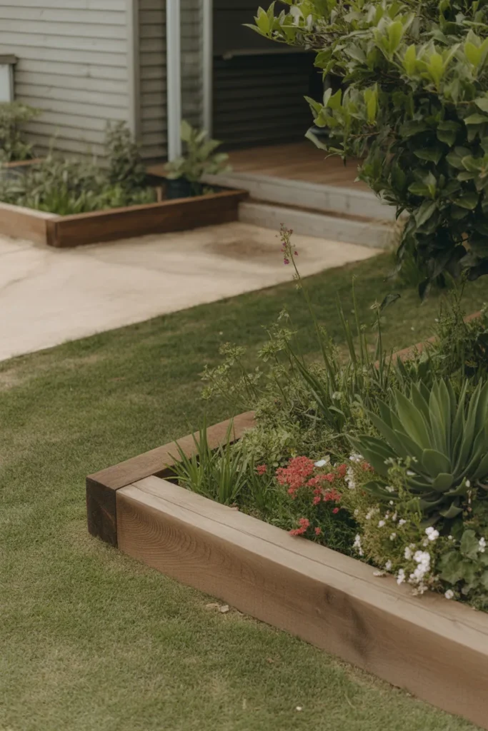 Wooden sleepers provide a bold and sturdy edge in front yard landscaping. Their thick structure makes flower beds stand out with strong visual definition. This style is ideal for contemporary homes with geometric garden layouts. It adds durability while giving your plants a beautifully framed space.