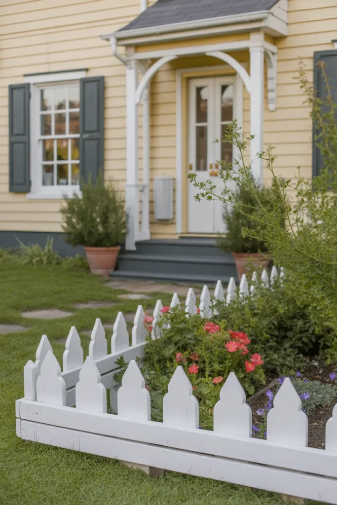 Painted wooden edging adds brightness and personality to the front yard. A white or neutral finish complements vibrant blooms beautifully. This option works well for homes with classic or coastal themes. It creates a crisp and fresh look around your plants.